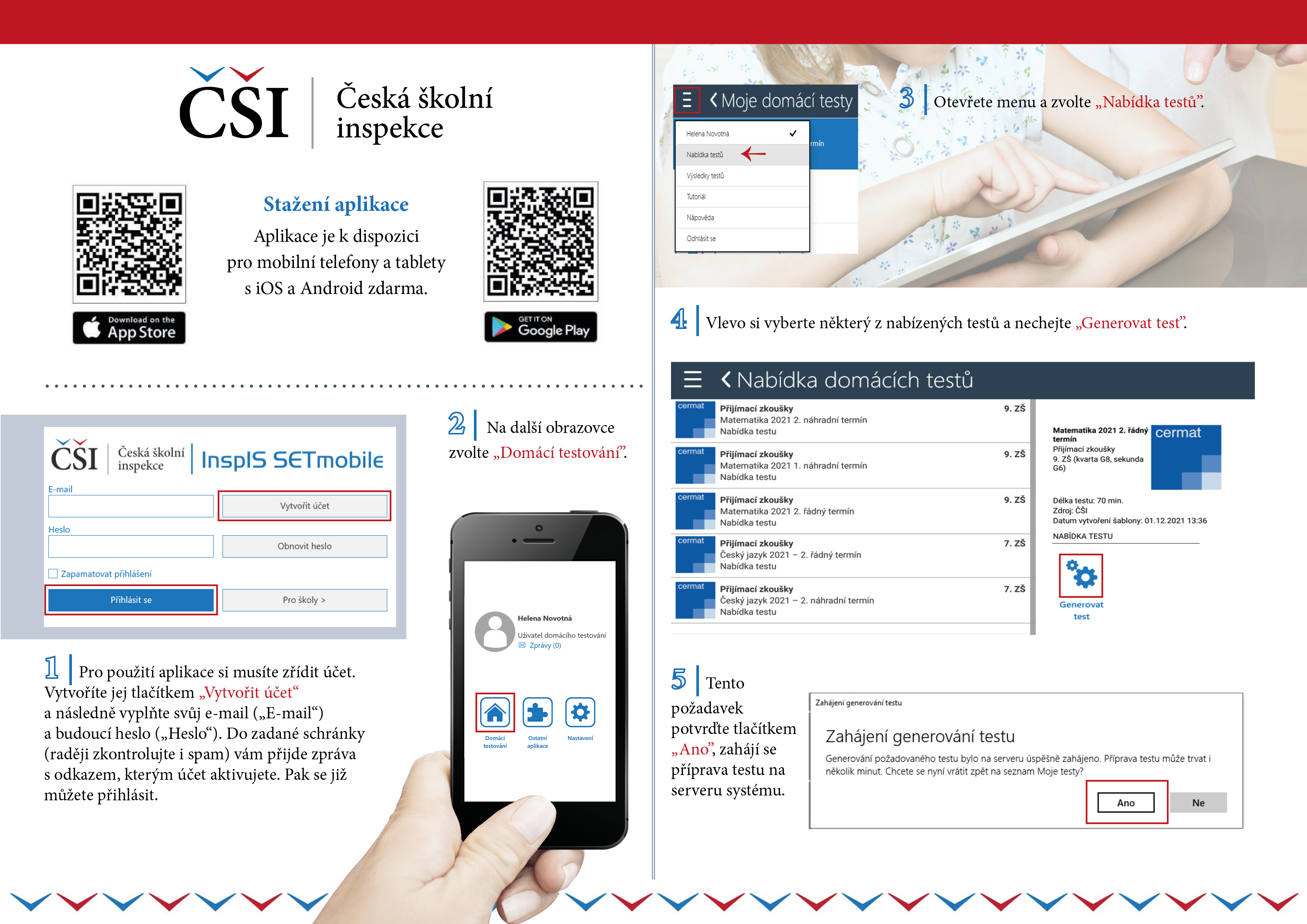 Aplikace InspIS SETmobile je ke stažení zdarma prostřednictvím App Store, Google play nebo Windows Store (podle toho, jakým operačním systémem je příslušný chytrý telefon nebo tablet vybaven). Stačí zadat název inspis a následně aplikaci stáhnout. Po otevření aplikace se uživatel zaregistruje a následně v nabídce testů (Domácí testování) uvidí všechny dostupné testy (s logem CERMAT). Vybraný test vyplní a zobrazí se mu vyhodnocení včetně úspěšnosti v jednotlivých otázkách.