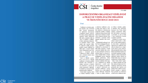 Česká školní inspekce připravila pro školy několik doporučení týkajících se organizace vzdělávání a práce se vzdělávacím obsahem ve školním roce 2020/2021. Dokument byl zaslán školám spolu s dalšími materiály a podklady připravenými Ministerstvem školství, mládeže a tělovýchovy.