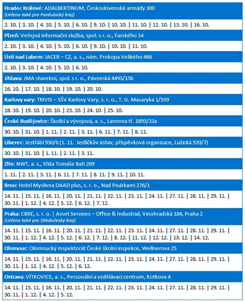 Jednodenní semináře (9:00 – 15:00) pro skupiny max. 15 účastníků se od října do prosince 2017 uskuteční ve většině krajských měst České republiky, a to v několika termínech: