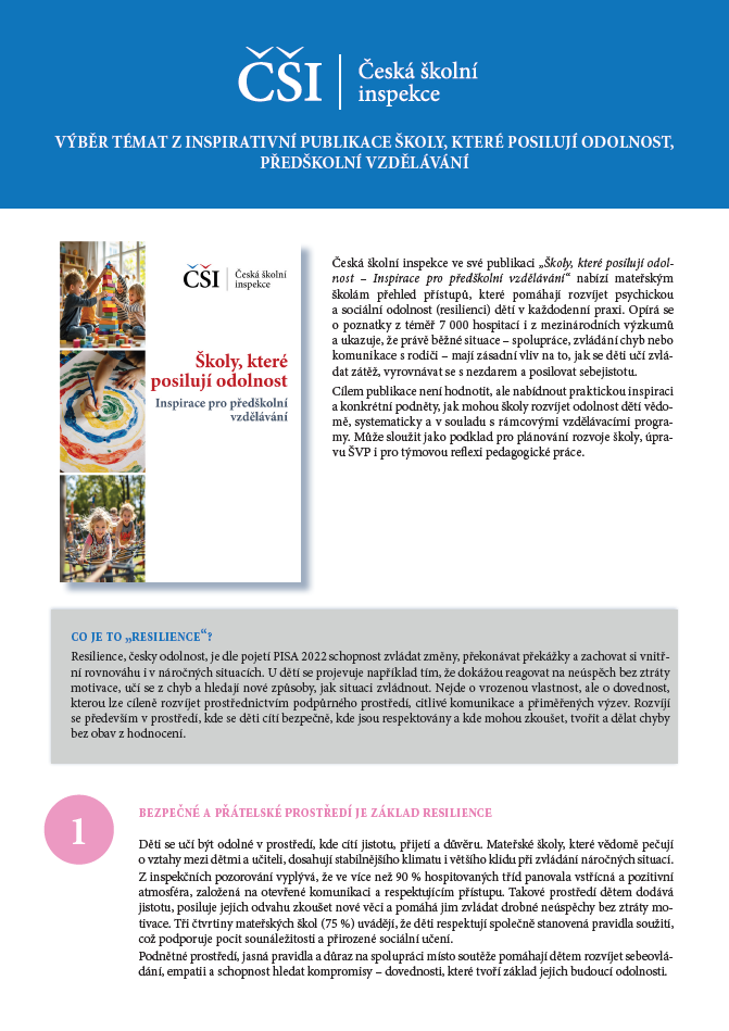 Publikace České školní inspekce přináší komplexní pohled na to, jak mateřské školy rozvíjejí odolnost dětí – tedy jejich schopnost vyrovnávat se s neúspěchy, zvládat emoce a zachovat si chuť učit se a objevovat. Analýza téměř 7 000 hospitací ukazuje, že české mateřské školy dokážou vytvářet bezpečné, přátelské a tvořivé prostředí, které rozvíjí samostatnost, spolupráci i sociální dovednosti dětí.