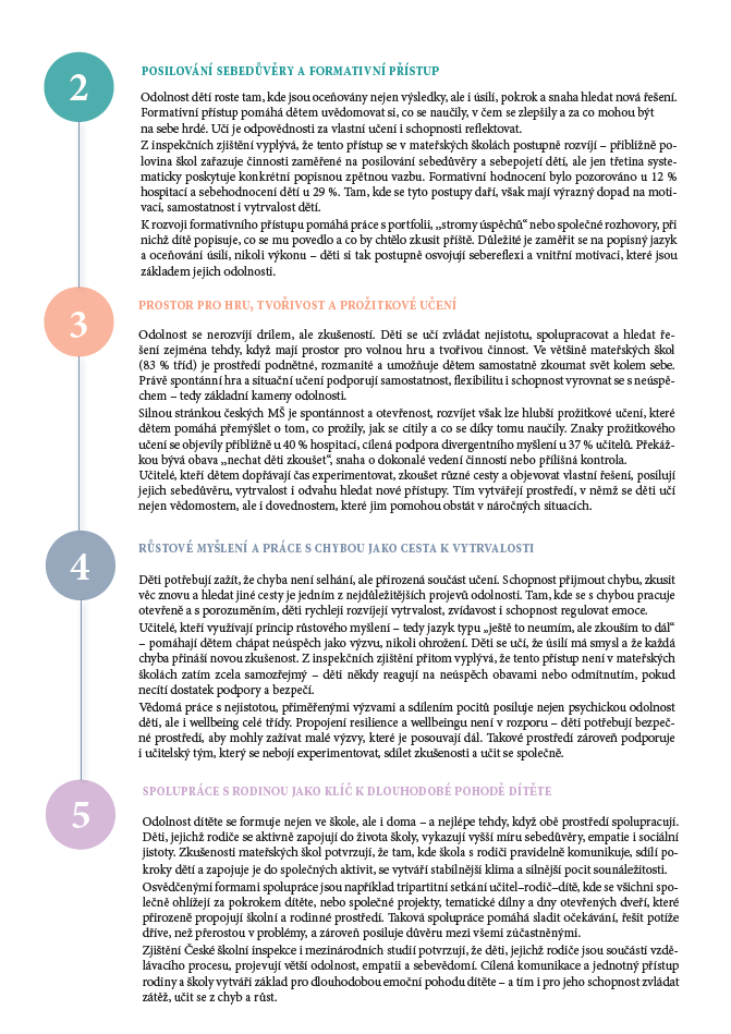 ČŠI proto doporučuje, aby mateřské školy tyto principy začleňovaly přímo do svých vzdělávacích programů a rozvíjely práci s portfolii či sebereflexí dětí. Důležitým prvkem je i propojení wellbeingu a resilience – tedy rovnováhy mezi bezpečím a výzvou. Dítě potřebuje jistotu a přijetí, aby mohlo zvládat nové situace a učit se reagovat na překážky.