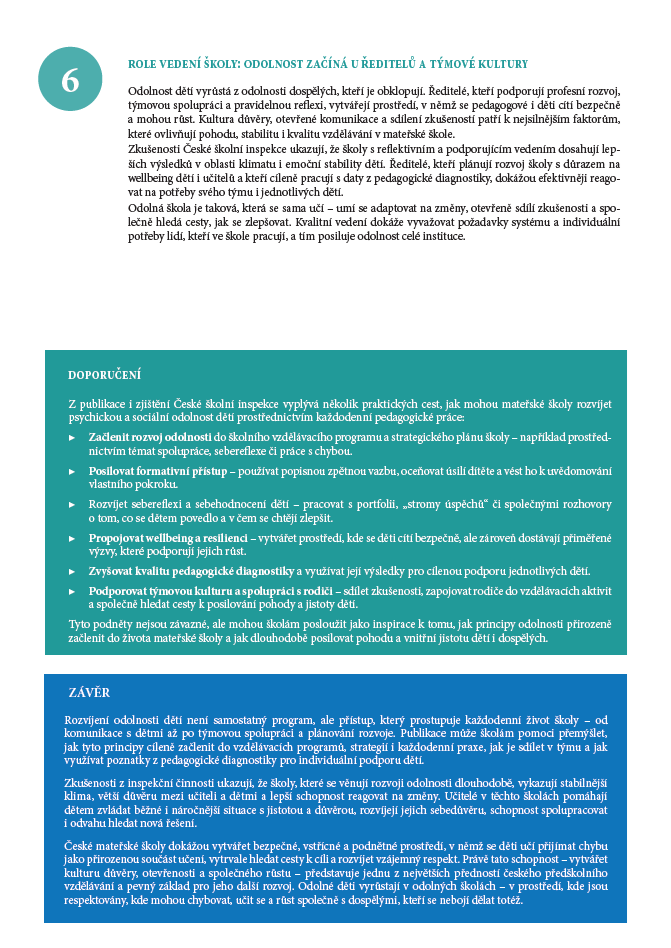 Klíčovou roli přitom hraje vedení školy: svou podporou učitelů, sdílením zkušeností a spoluprací s rodiči vytváří kulturu, v níž se daří dětem i dospělým. Odolné děti vyrůstají v odolných školách – tam, kde se dospělí nebojí mluvit o chybách, učí se jeden od druhého a společně hledají cesty, jak dětem pomoci zvládat svět kolem sebe s jistotou a důvěrou.