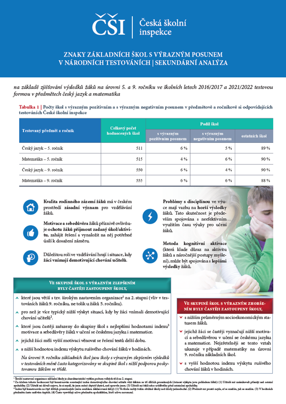 Česká školní inspekce realizovala ve školních letech 2016/2017 a 2021/2022 rozsáhlá zjišťování výsledků žáků na úrovni 5. a 9. ročníku základních škol ve vzdělávacích oblastech český jazyk a matematika. Tím, že žáci více než 500 základních škol absolvovali v obou školních letech testování ve stejném předmětu i ročníku, vznikají dvě zajímavé otázky: Lze mezi oběma školními roky identifikovat základní školy, jejichž žáci zaznamenali výrazný posun v předmětově a ročníkově si odpovídajících testováních? Jaké jsou znaky základních škol, u nichž byl zaznamenán výrazný posun v předmětově a ročníkově si odpovídajících testováních? Právě na tyto dvě otázky se sekundární analýza zaměřuje.